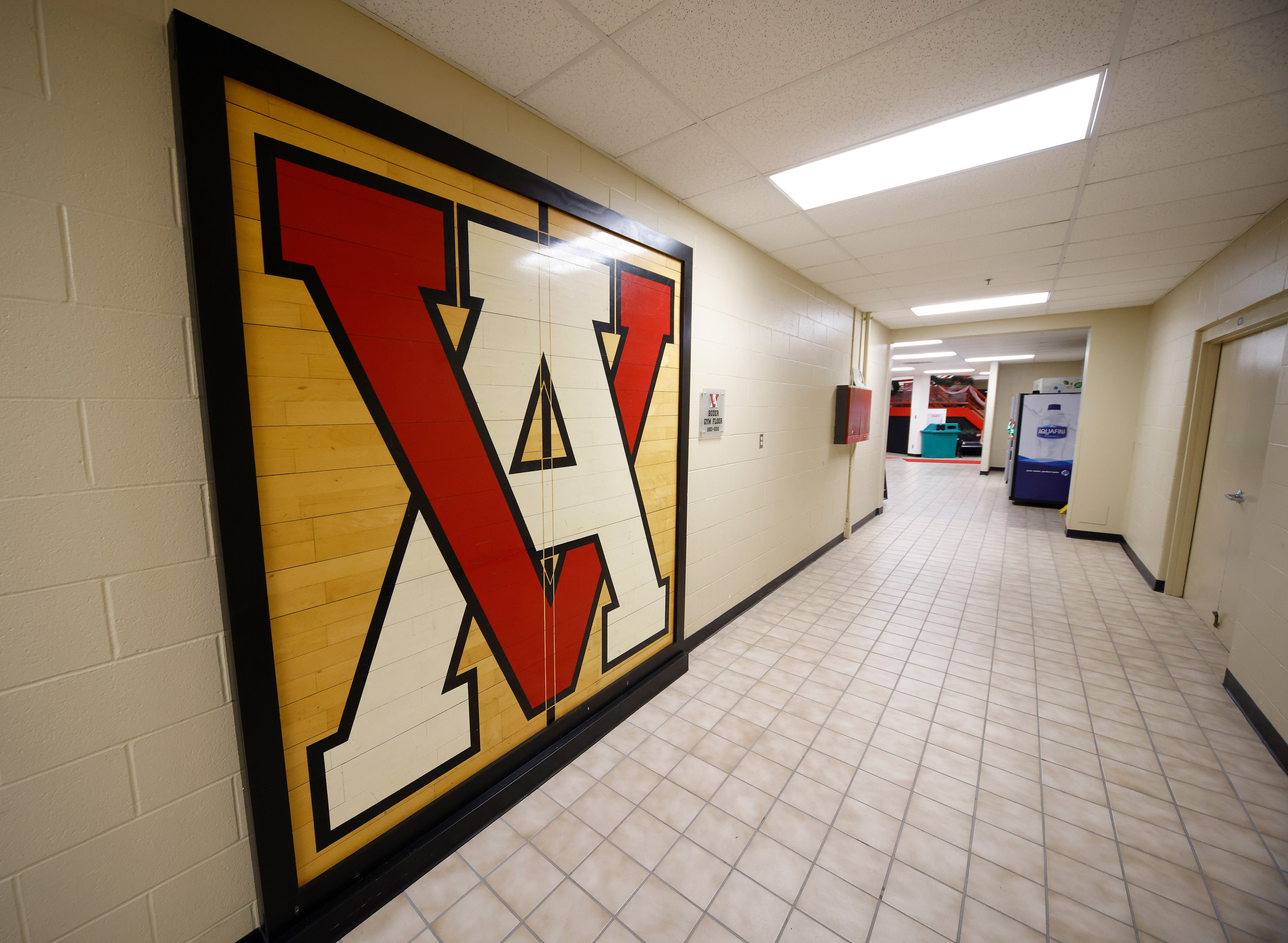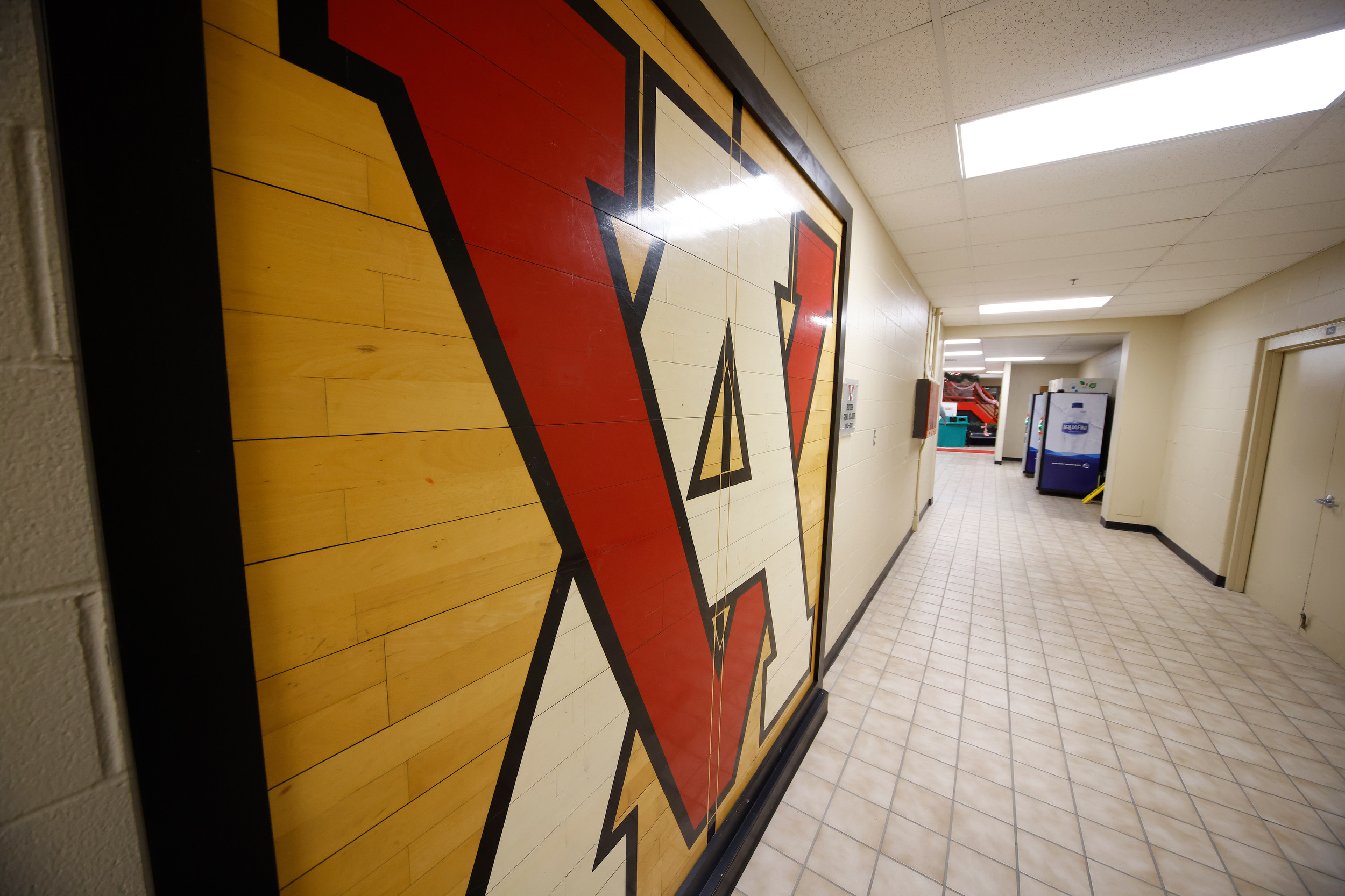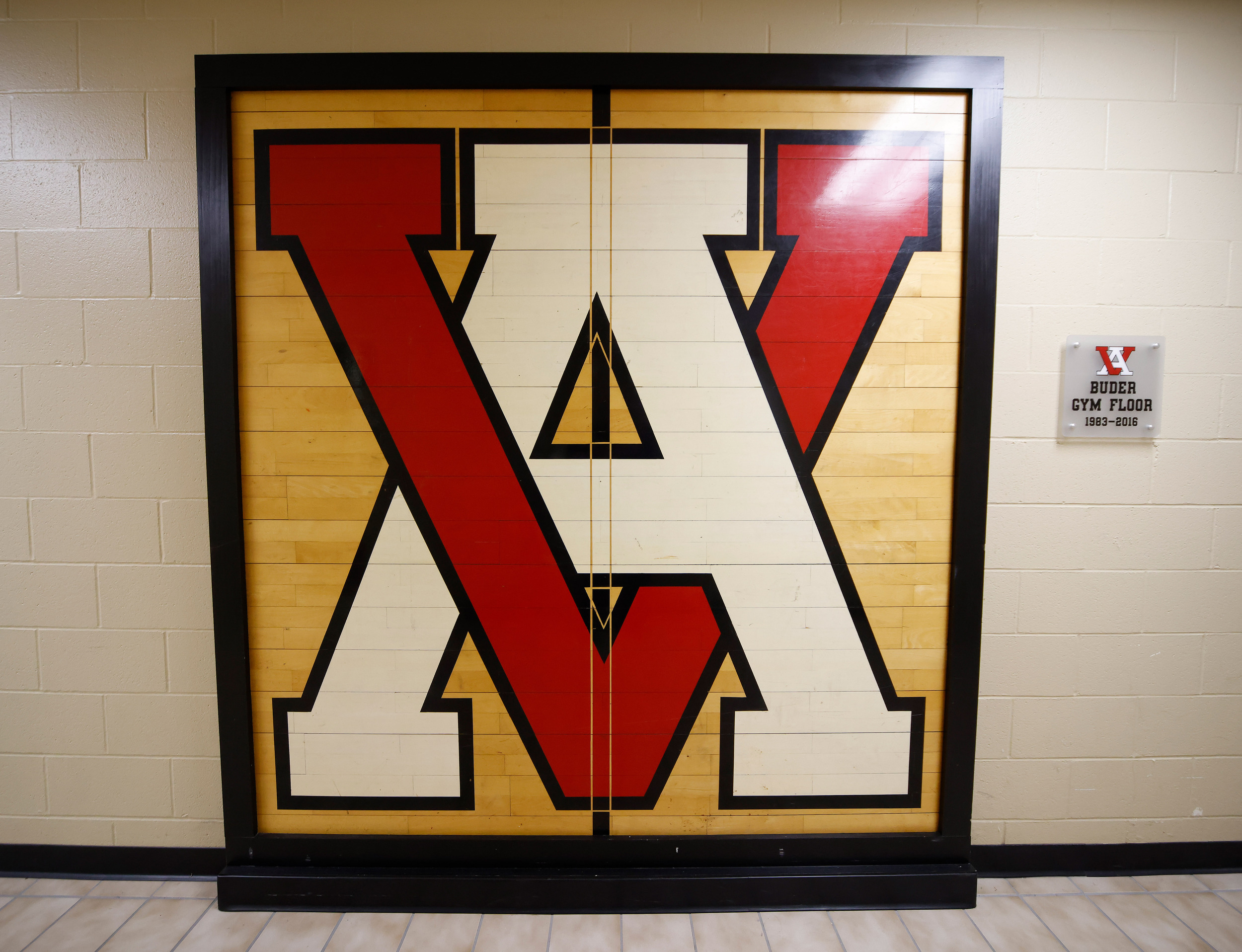 Center court of the original gym floor is framed and hung down a hallway, replaced during a 2016 renovation. The original center court design was an overlapping “V” and “A” but the current gym has the school’s common nickname — “VIZ”.
