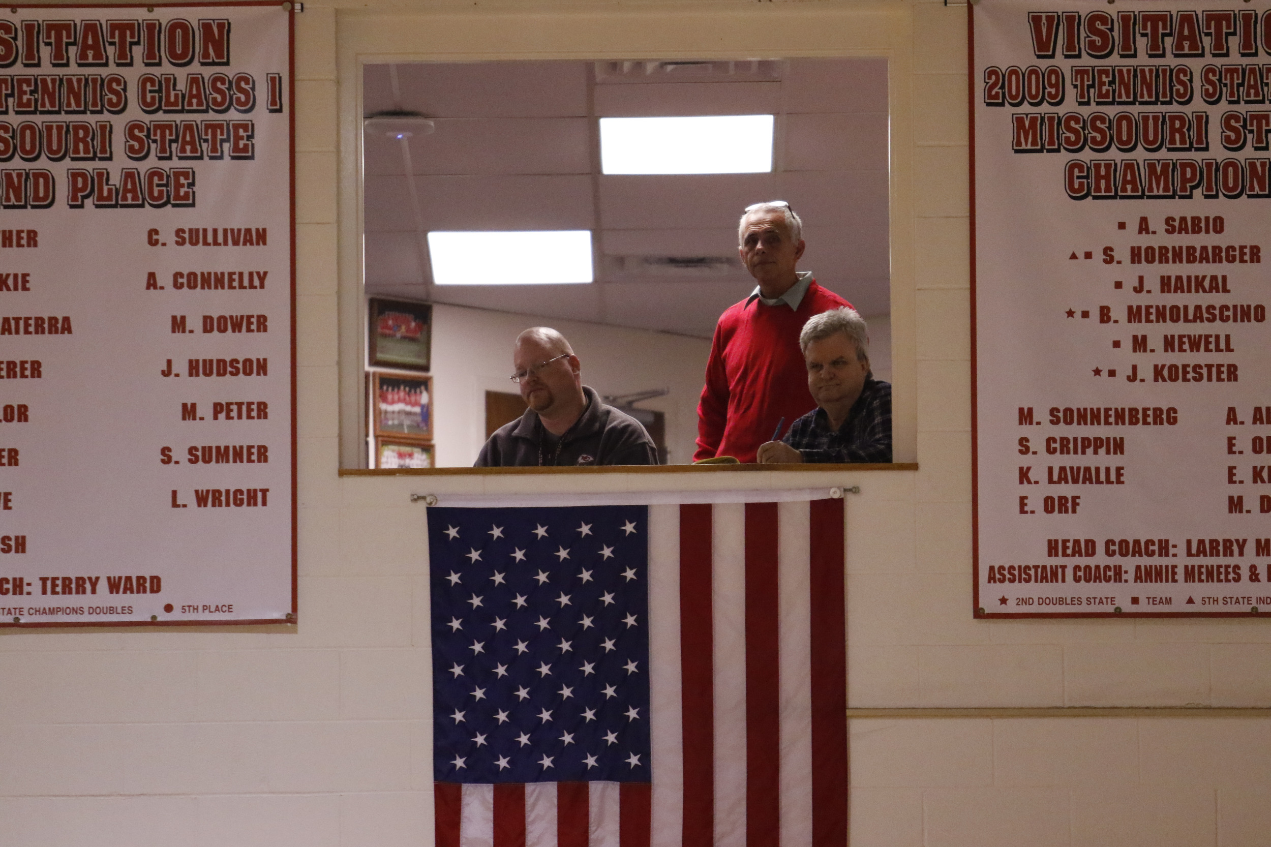 The former athletic office had a unique second story opening to the gym, but that window was closed when the room was needed for classroom use and the athletics office moved.